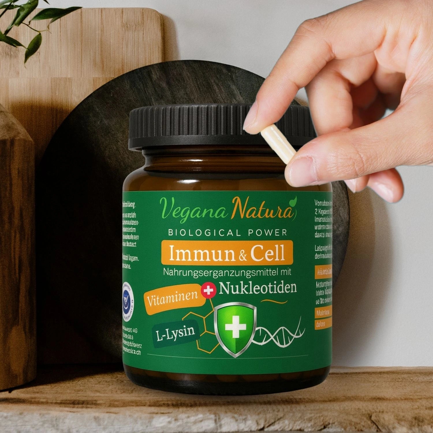 Die IMMUN & CELL + NUKLEOTIDE Kapseln bieten dir einen sehr hohen Gehalt an Nukleotiden und eine spezielle Erkältungsformel. Sie sind laktose- und glutenfrei, enthalten keine künstlichen Aromen und werden schonend hergestellt. Somit bieten sie dir eine optimale Qualität und eine hohe Bioverfügbarkeit.
